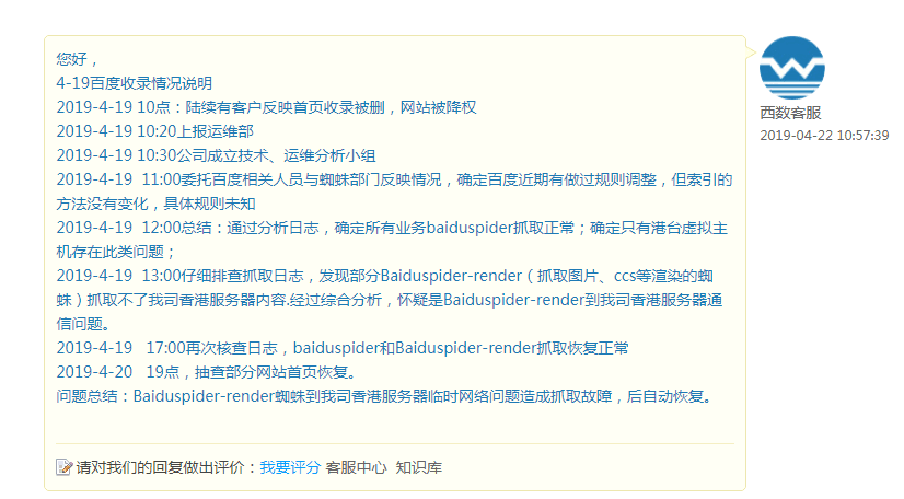 最后西部數碼給出解釋是百度的渲染蜘蛛到達西部數碼的香港空間網絡互通問題出現了問題,百度蜘蛛訪問不了西部數碼香港空間,從而導致空間被k,讓各位代理商以及站長耐心等待百度恢復。